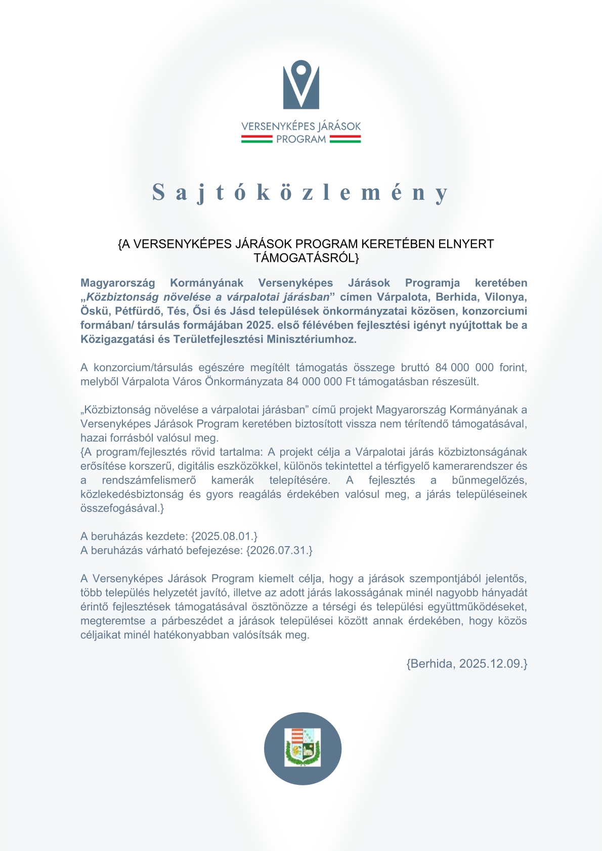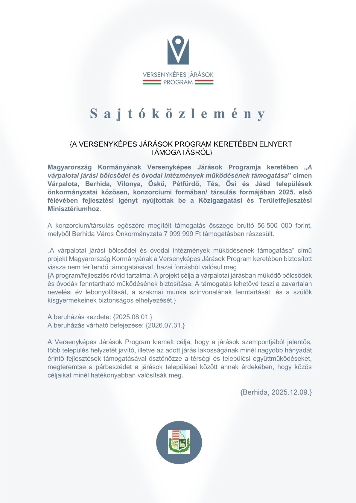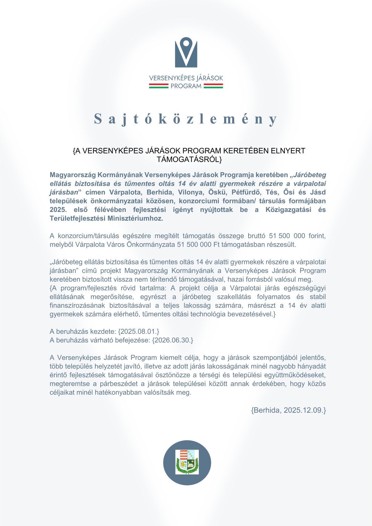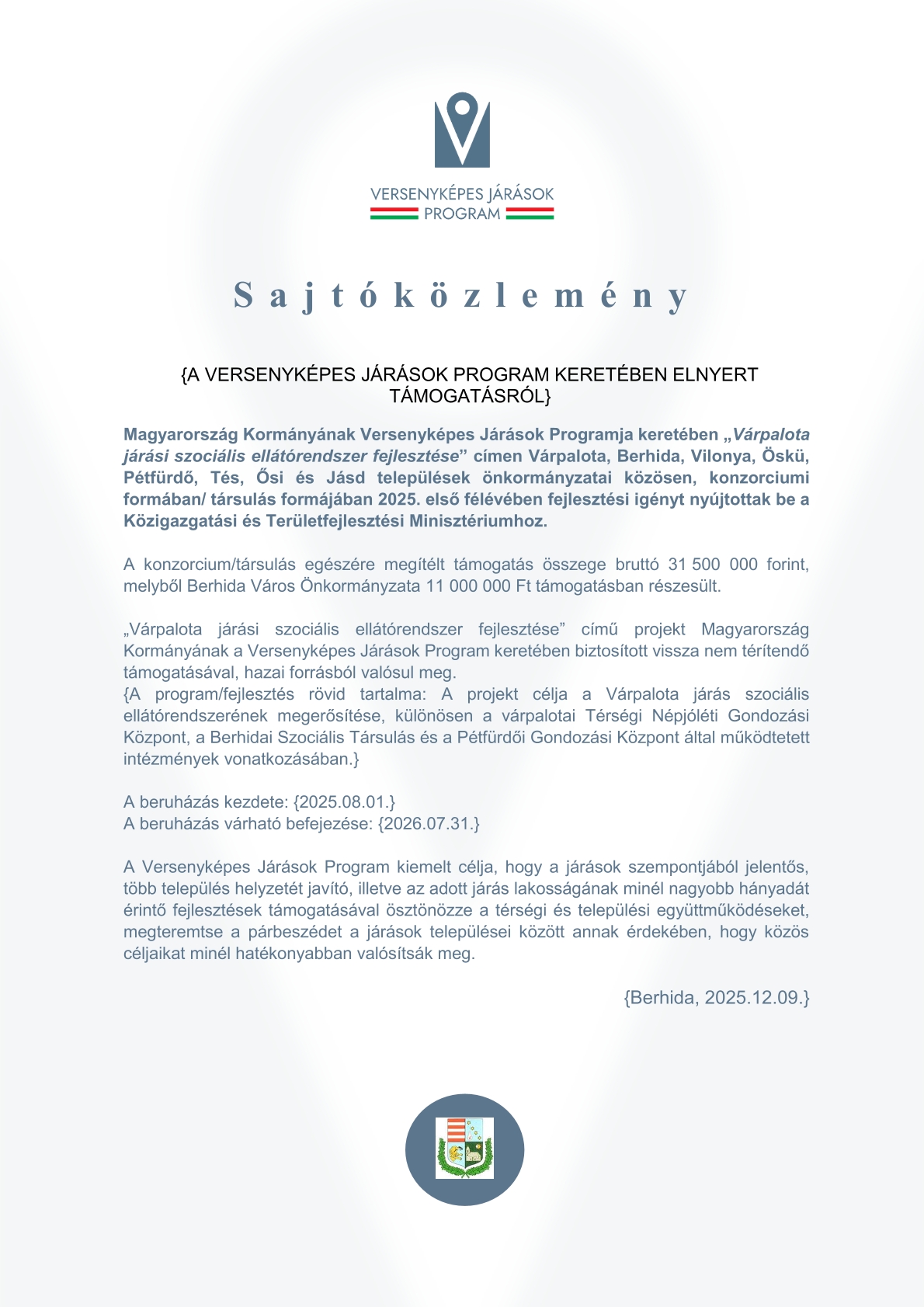 Csatolmány(ok): BERHIDA VJP Várpalota Pétfürdő-Berhida-Ősi kerékpárút tervezés közlemény686.77 KB BERHIDA VJP Várpalota járási szociális ellátórendszer fejlesztése_közlemény646.49 KB BERHIDA VJP Közbiztonság növelése a várpalotai járásban közlemény663.53 KB BERHIDA VJP Járóbeteg ellátás biztosítása és tűmentes oltás 14 év alatti gyermekek részére a várpalotai járásban_közlemény695.5 KB BERHIDA VJP A várpalotai járási bölcsődei és óvodai intézmények működésének támogatása közlemény678.23 KB